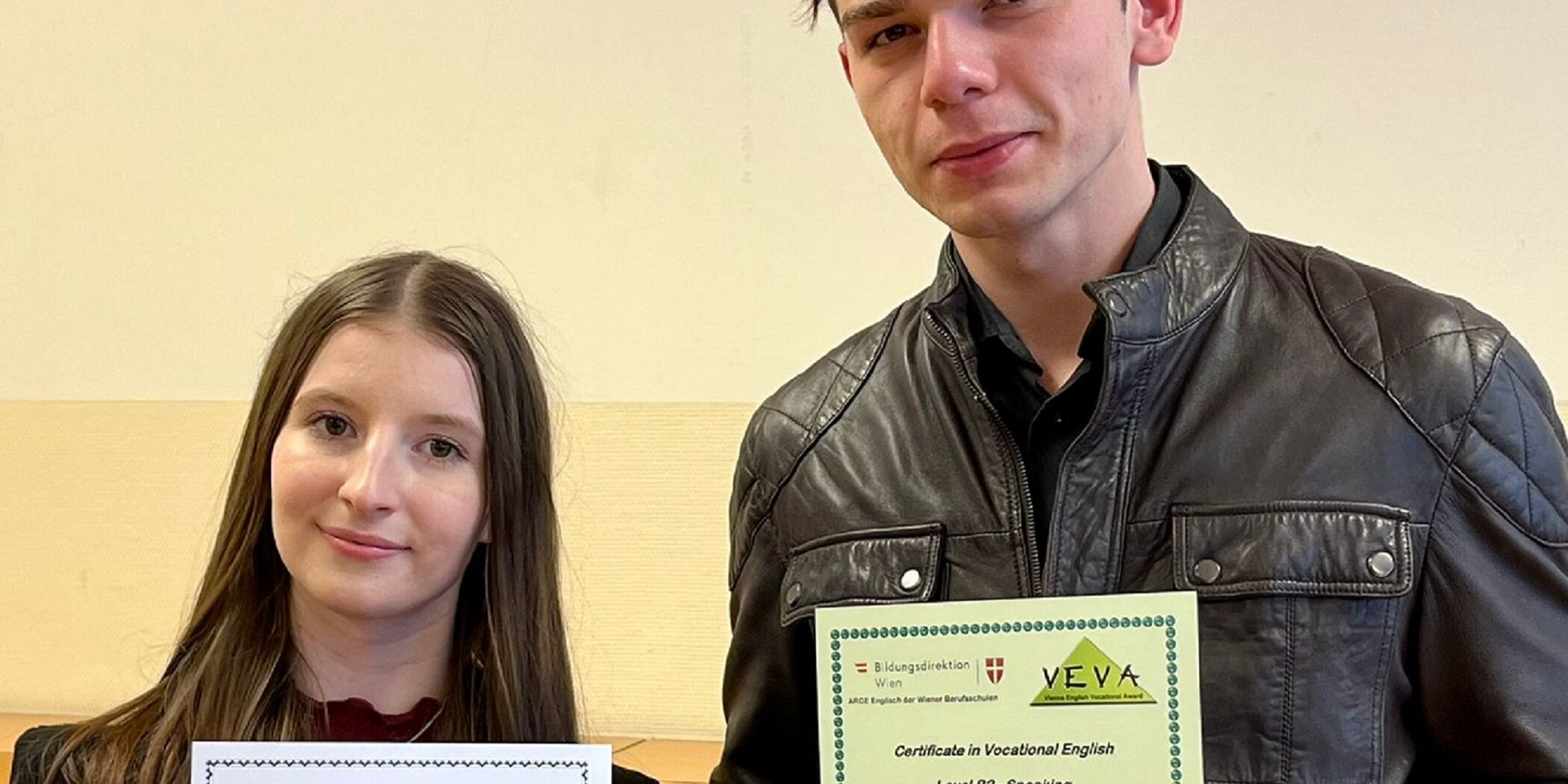 Die Berufsschule Industrie Finanzen und Transport gratuliert den beiden TeilnehmerInnen Cristian Mihaila (3. Klasse Versicherungskaufmann, Finalist) und Laura Ringel (2. Klasse Bankkauffrau) zur fantastischen Leistung beim Sprachencontest VEVA (Vienna English Vocational Award).